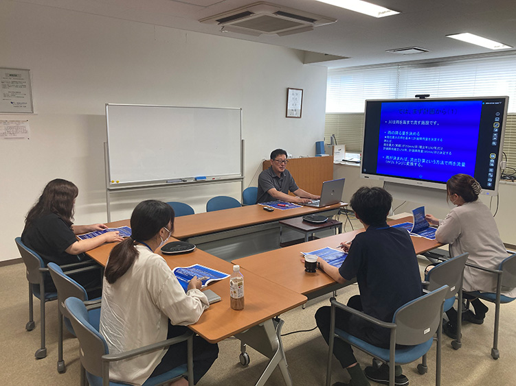 内容は、「建設コンサルタントの役割」「河川の計画から設計」「河川屋に必要な基準書」 「水門・樋門(管)・排水工について」「用語集」「業務の発注方法と受注のしくみ」など基本的な内容で、パワーポイントやホワイトボードを使い技術継承をしています。